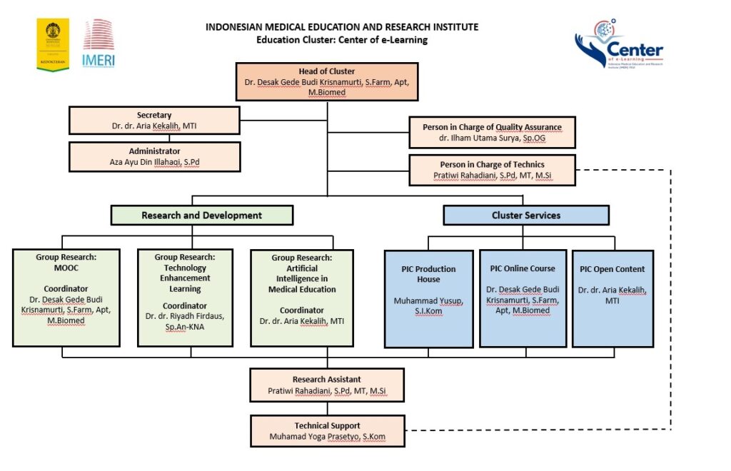 Center of e-Learning Cluster is one of IMERI’s Medical Education Clusters which is focused on developing and implementing e-learning activities, such as distance learning (PJJ), open course (OC), and open content (OR) with national and international standards. Our cluster has collaborated with various parties related to the South East Asia Ministry of Education Organization Regional Open Learning Center (SEAMEO SEAMOLEC), the Telemedicine Development Center (TEMDEC-Asia), as well as various clusters at IMERI. The form of collaboration is in the form of research and development of e-learning, especially the Massive Open Online Course (MOOC), OC and OR. In order to support the development of e-learning, our cluster is also supported by a Production House (PH) unit which specialized in making digital contents.In order to achieve the target of research and publication outputs in 2020, the Center of e-learning cluster has attempted to carry out research, development and publication related to distance learning, the use of Learning Management System (LMS) and the MOOC platform. Development or innovation related to the IMERI MOOC (Online Course IMERI (OCI)) platform was carried out in collaboration with SEAMOLEC and the Information System Development Center for the Faculty of Medicine, University of Indonesia (PPSI FKUI). MOOC development is the continuity of the platform development stage in 2019. Next step in 2020, we focused on MOOC supporting features based on user needs from the OCI platform itself..